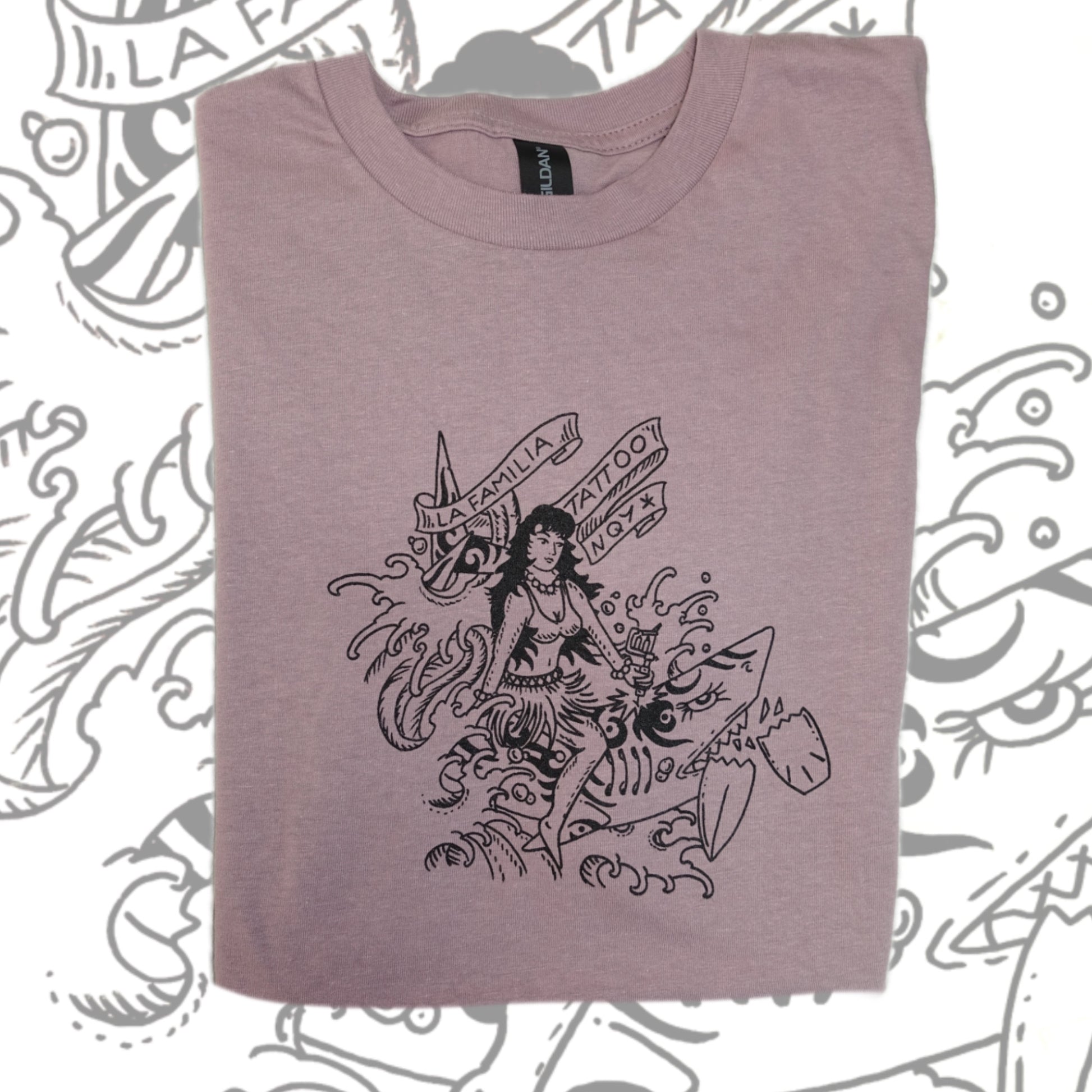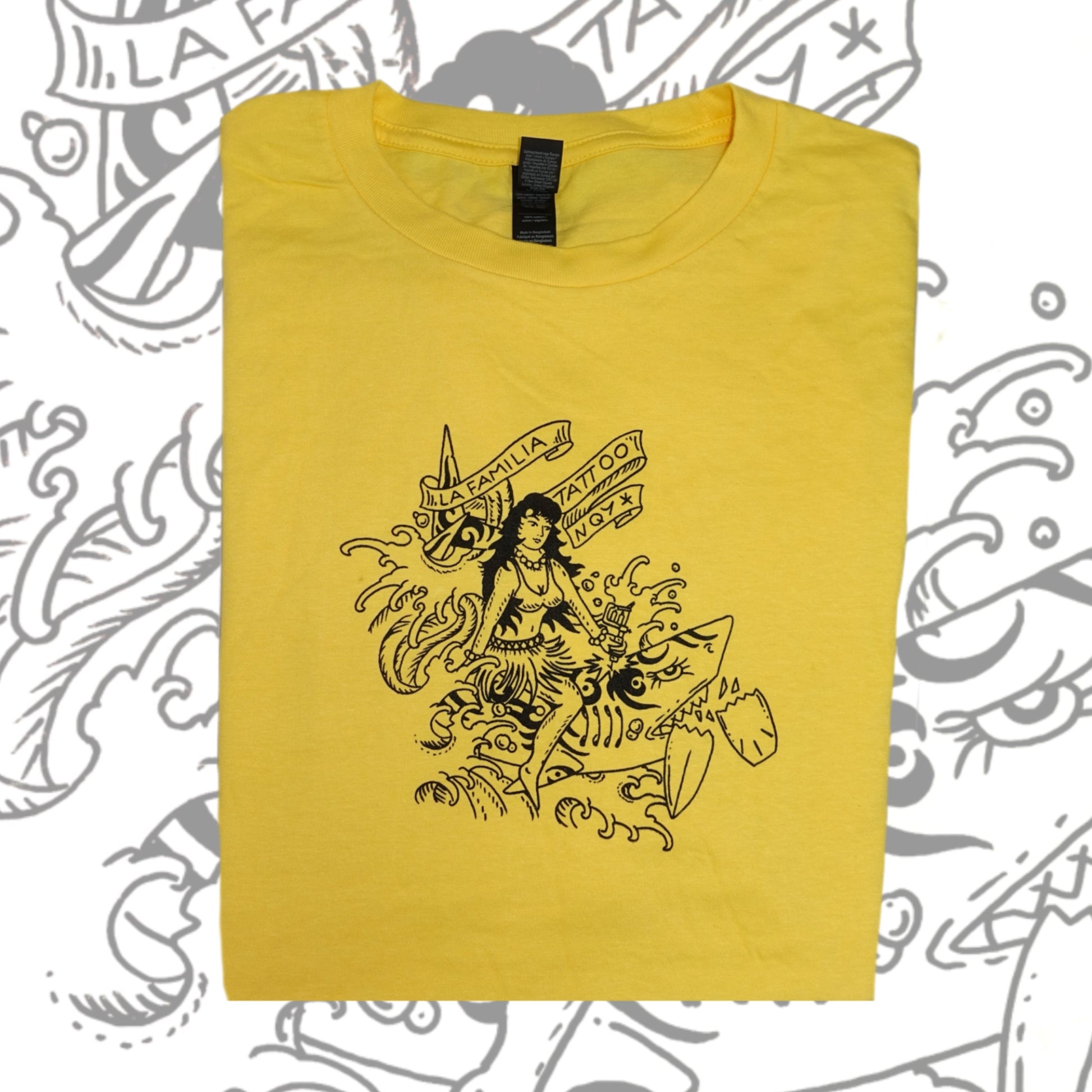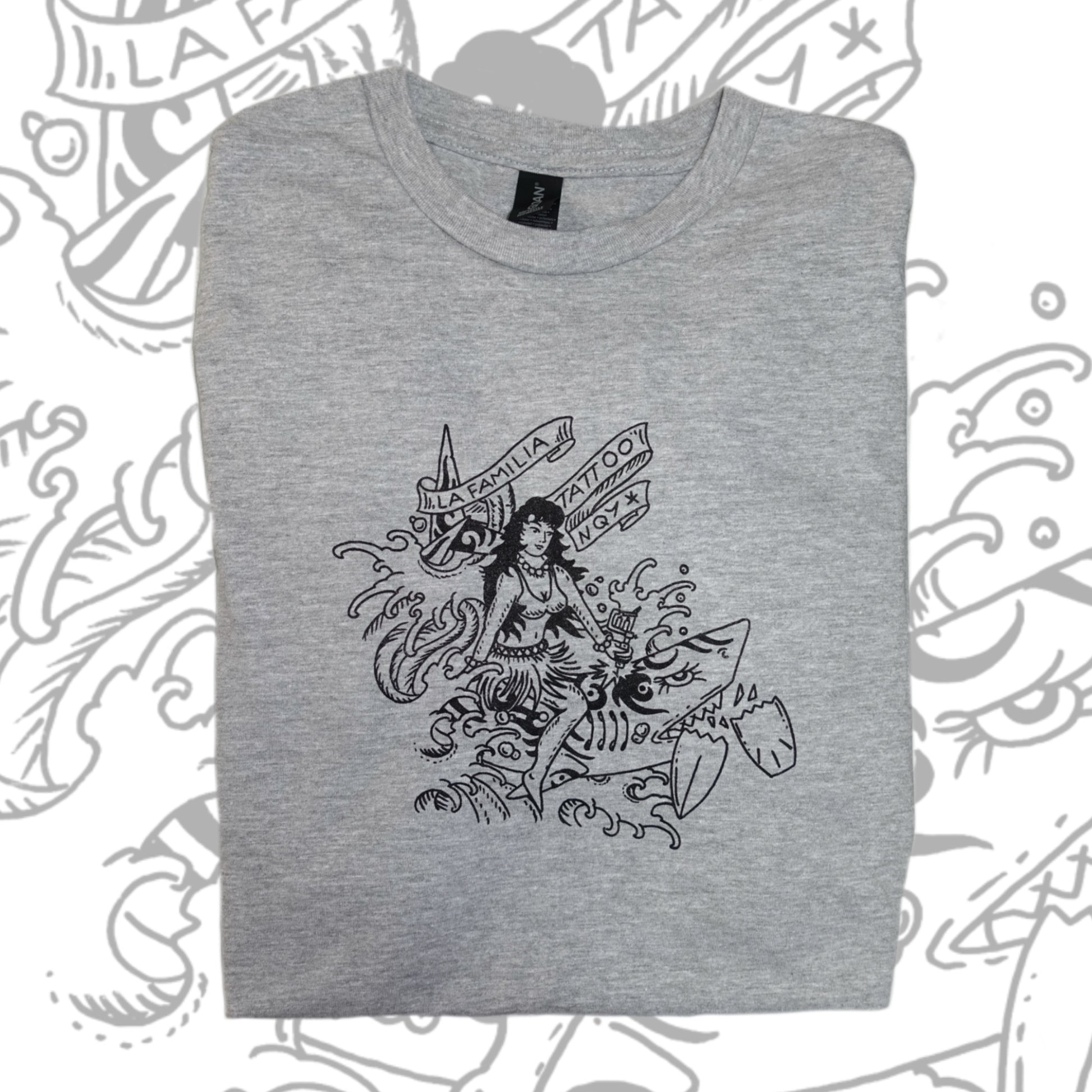 Gildan soft style mid weight t-shirt featuring a classic pin up girl surfing through some tribal waves by our Olly Streeter.